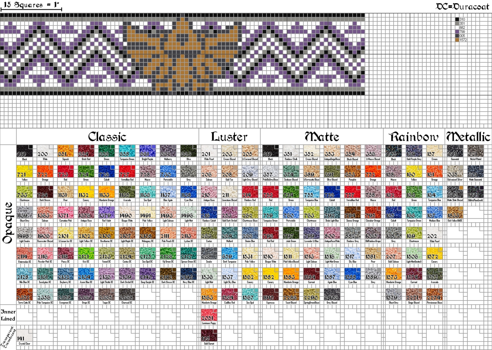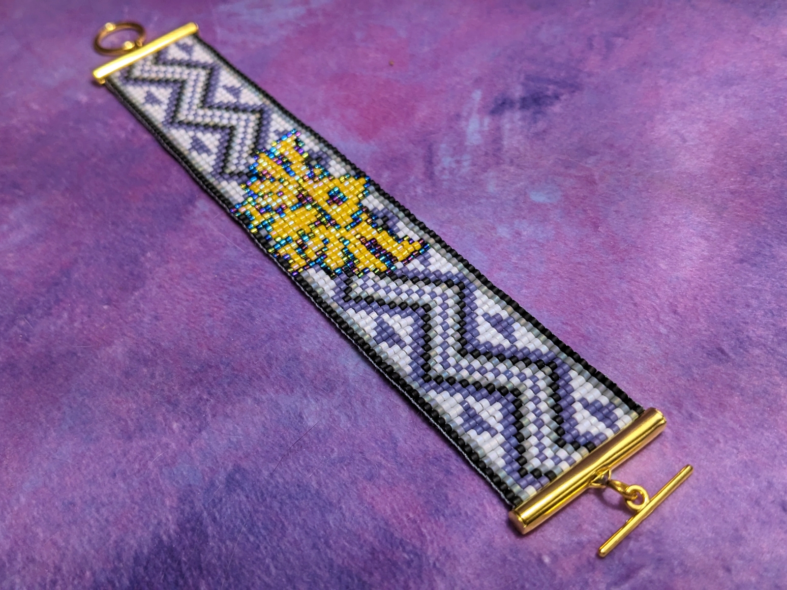 Bead loom bracelet design featuring the triangle force insignia from Legend of Silent Hero Who Likes to Wear Green, with an ace flag(purple, white, grey, & black) themed triangle/zig-zag background.