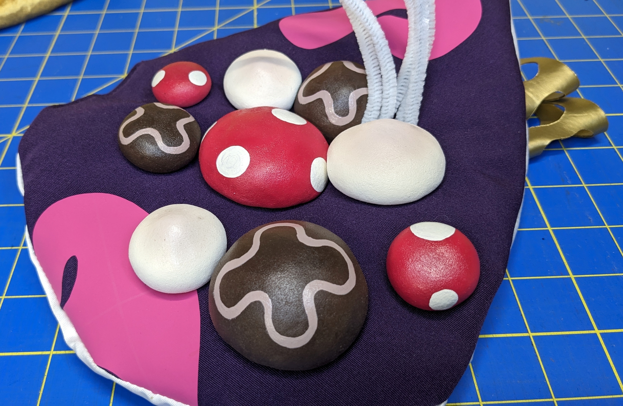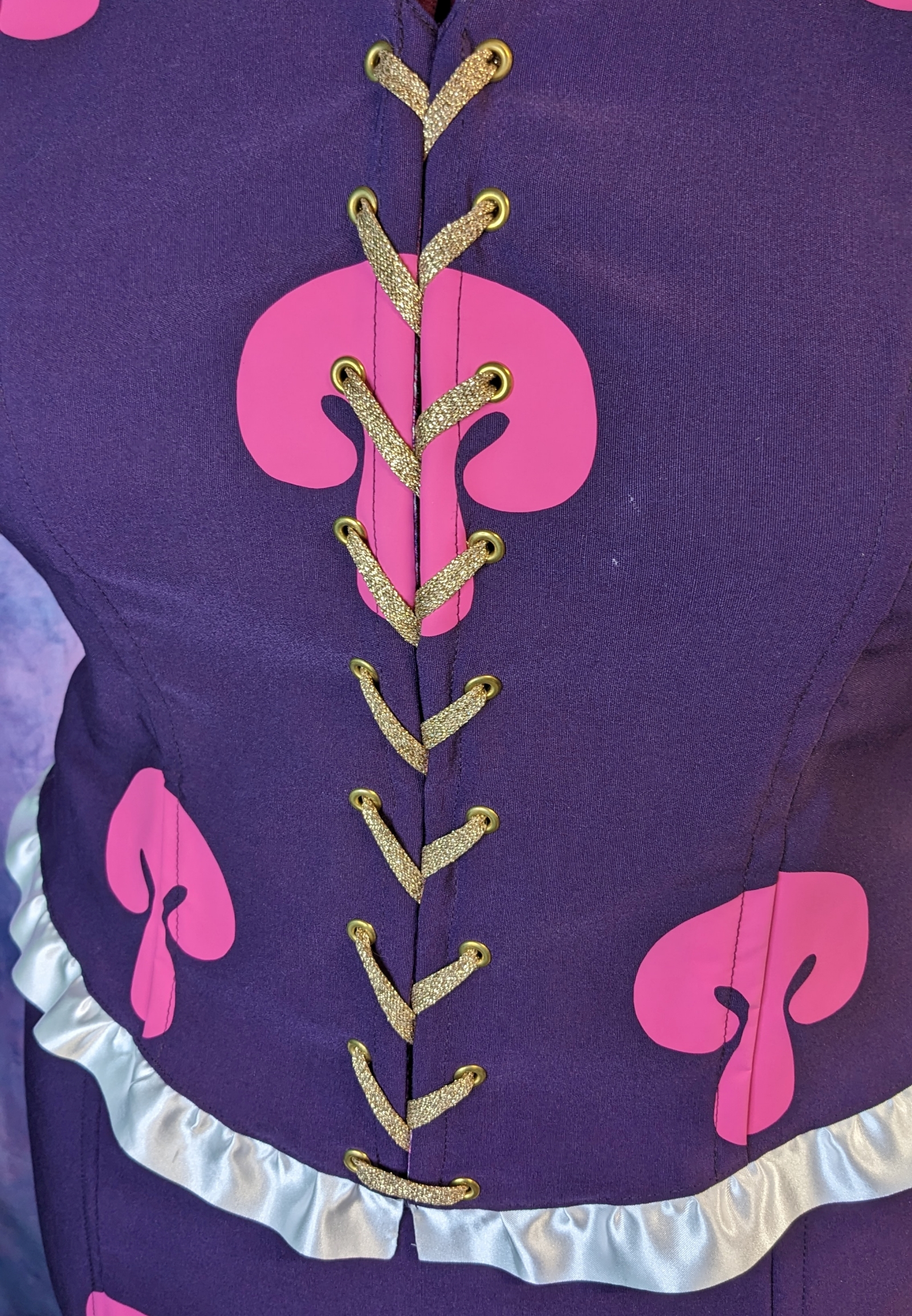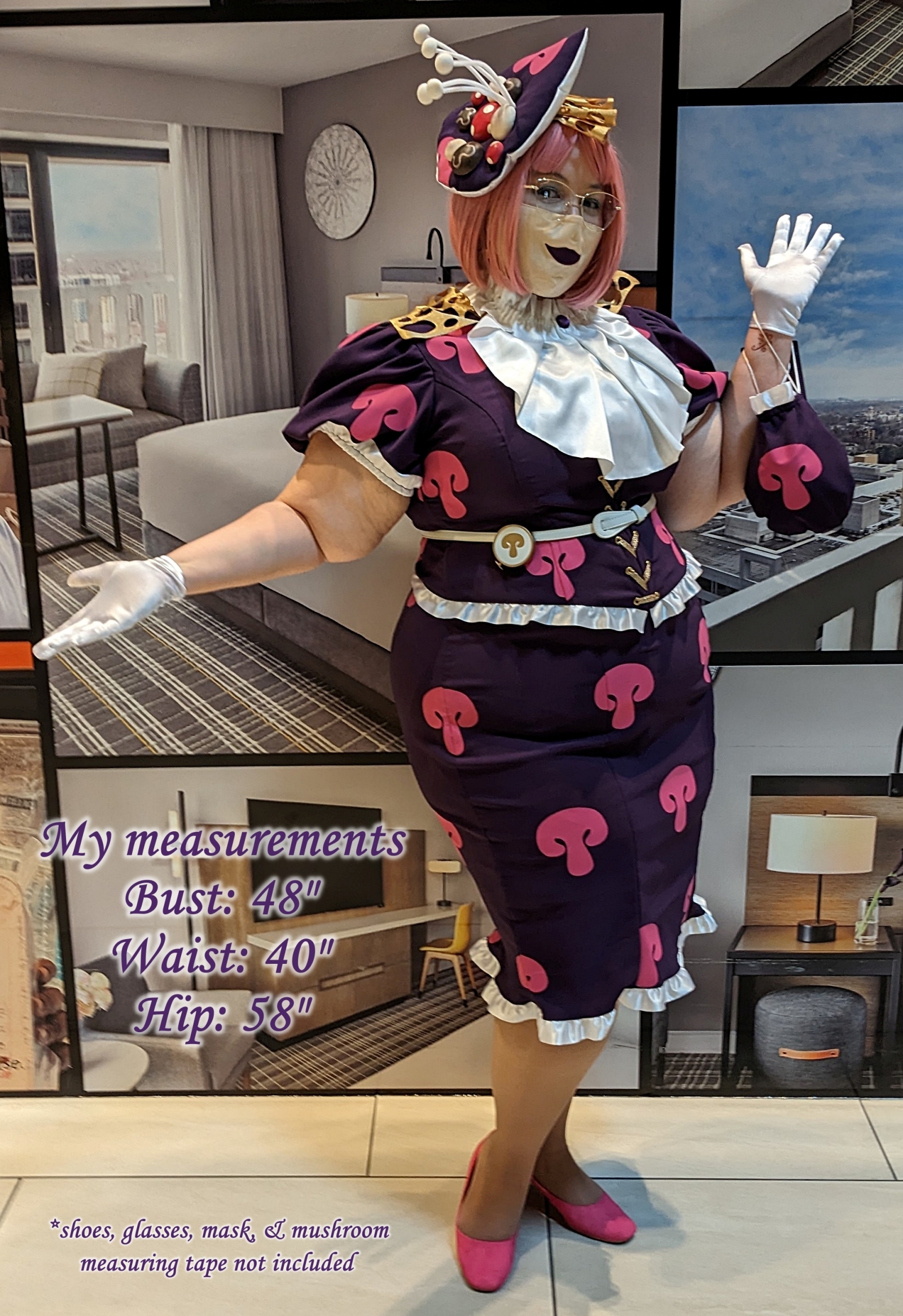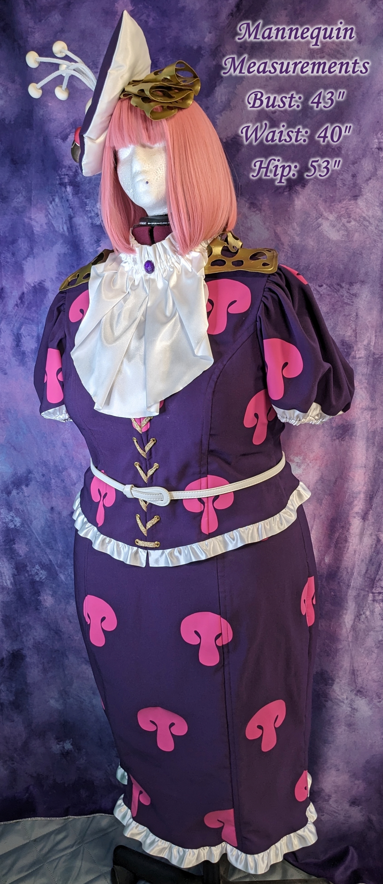 Made from stretch suiting, iron-on vinyl(mushroom designs), stretch satin(white accents), ultra light clay(hat shrooms), pipe cleaners(hat deco), & acrylic paint(hat shrooms). Both top and skirt have some light weight plastic boning to help keep the shape and reduce bunching, especially on the skirt. It's also machine washable(delicate cold, tumble dry low)! There's hidden hooks on the hat, belt & white collar. The mushroom design was also done entirely by hand, from tracing/cutting the shapes to application.