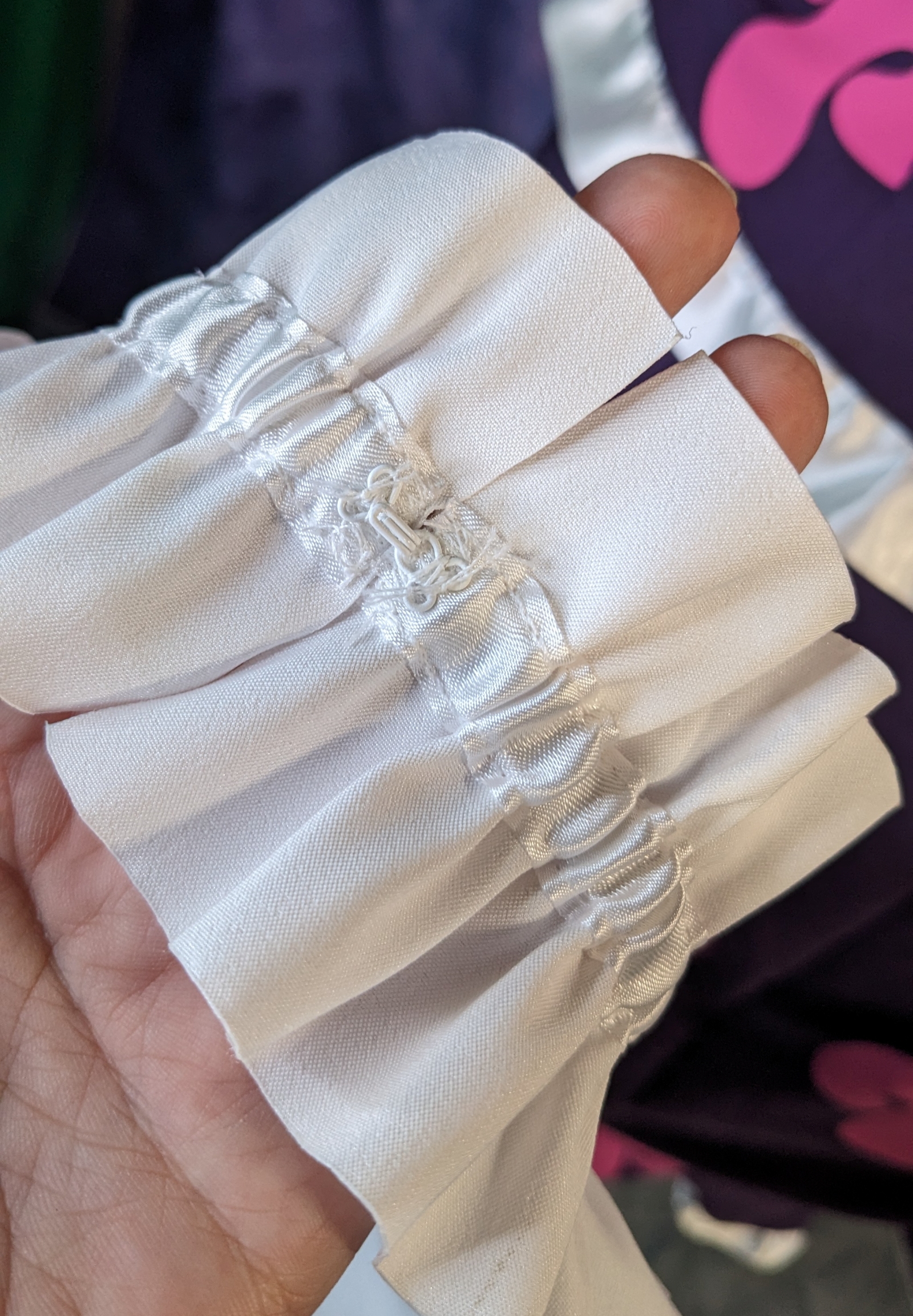 Wear/feel: Minimal lining helps reduce the heat significantly, but this one will still be a bit warm in hot/muggy climates. Skirt was a bit snug for me, but only in looks(I don't like to highlight the flub lol), walking was no problem at all. Wig was also a big snug, but I have a large head so it will likely fit fine on someone less than 24"(crown). The ribbon trim has a scratchy edge that may irritate your arms or snag your sleeves(if you're wearing the black sleeve bits that she does).