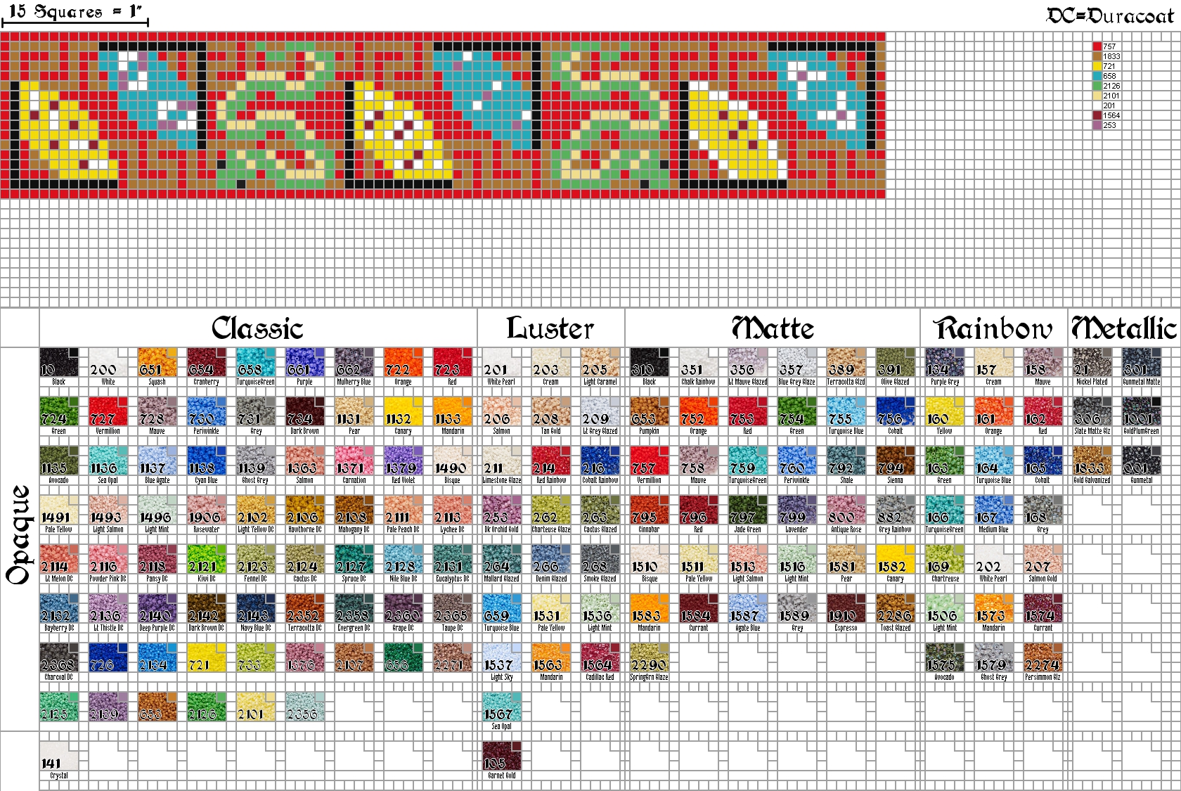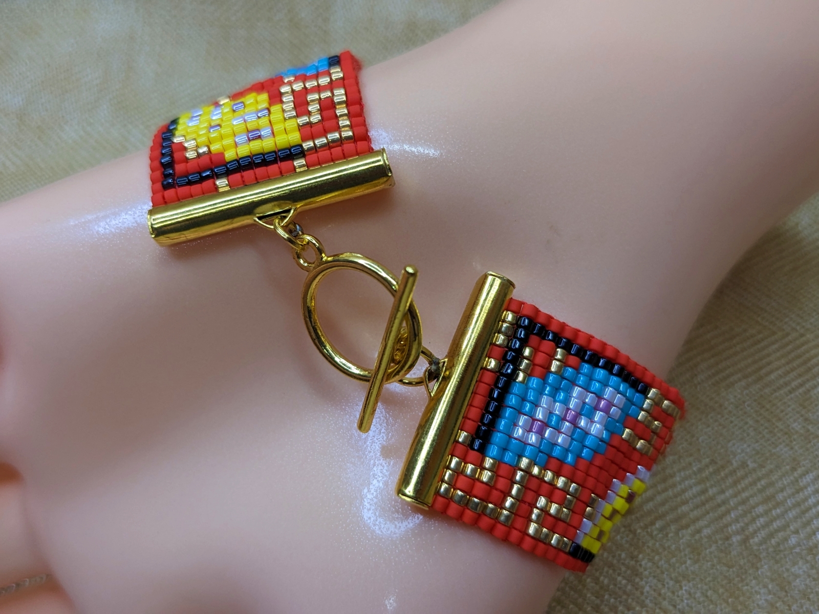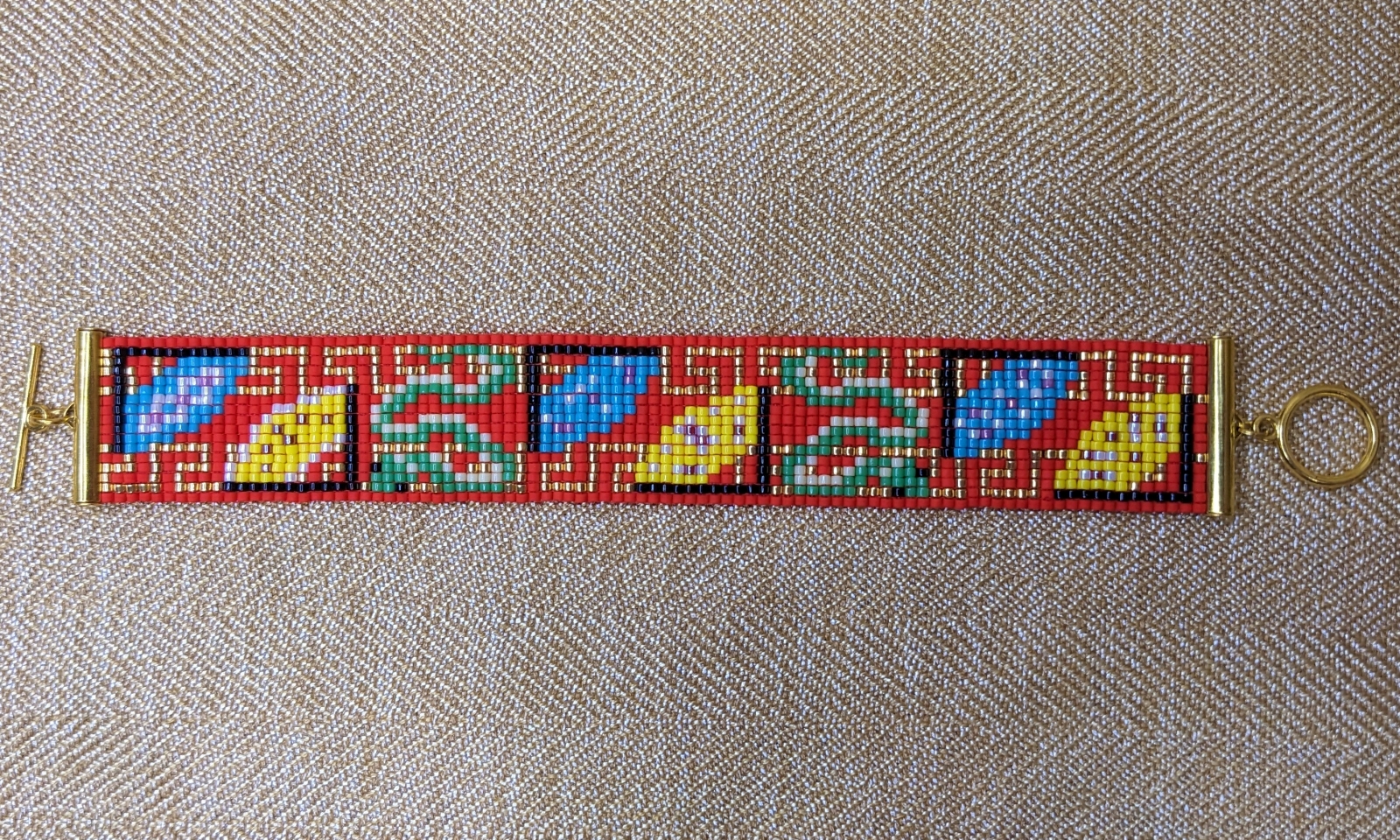 Bead loom bracelet design inspired by Chinese Year of the Snake. Featuring a red background with gold geometric borders. The design features two green/yellow snakes in between yellow and turquoise fans with varying patterns.