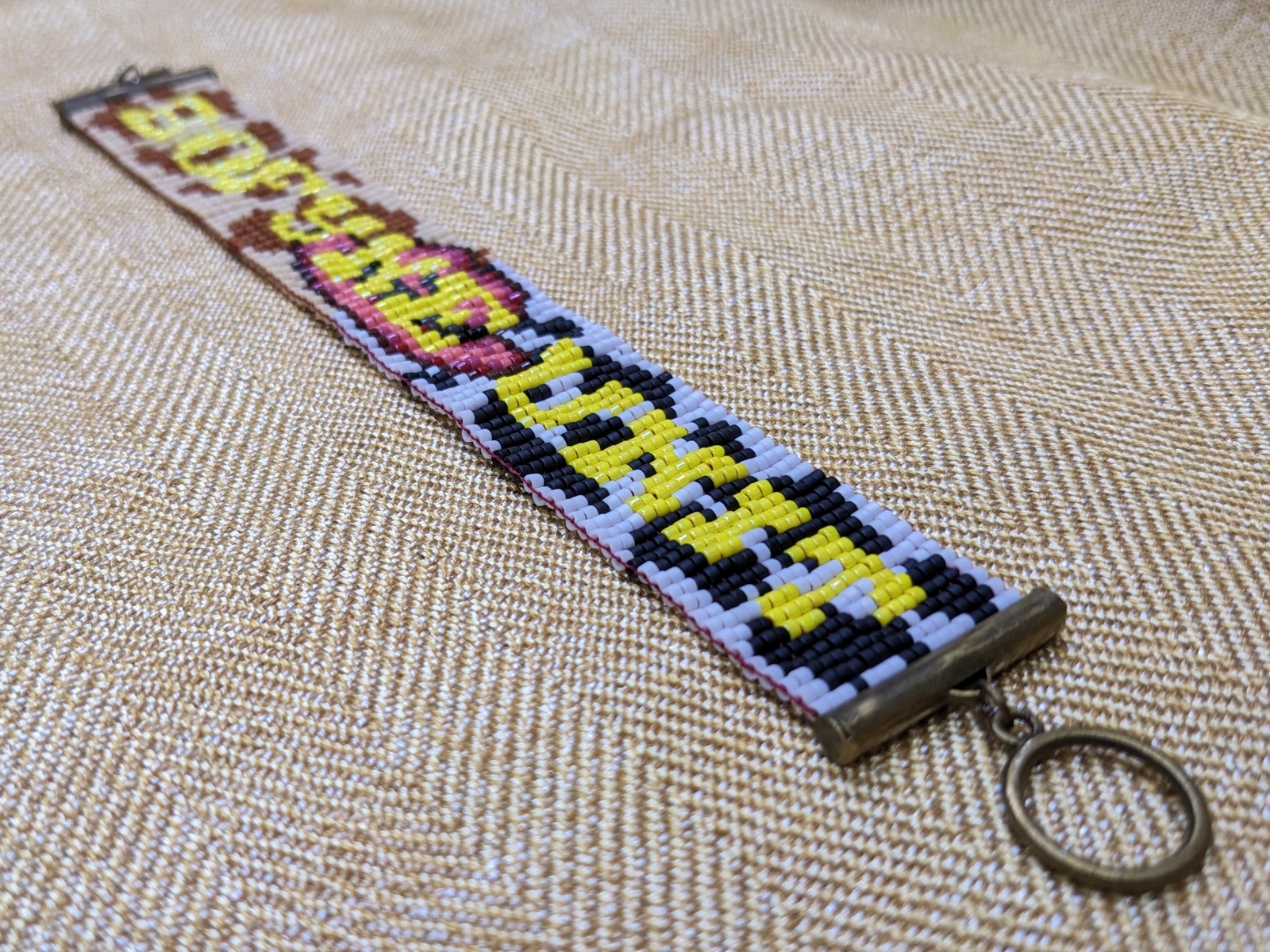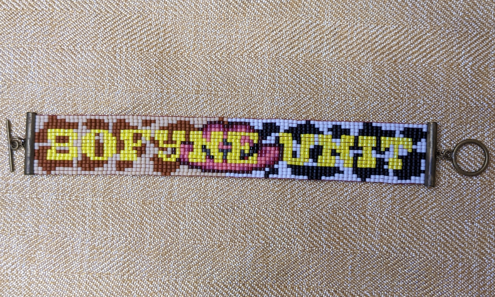 Bead loom bracelet design with a cow print background, half is cream/brown, half is black/white. "Bofyne Unit" is spelled out in bright yellow saloon-style font, with a brown cowboy hat in the center.