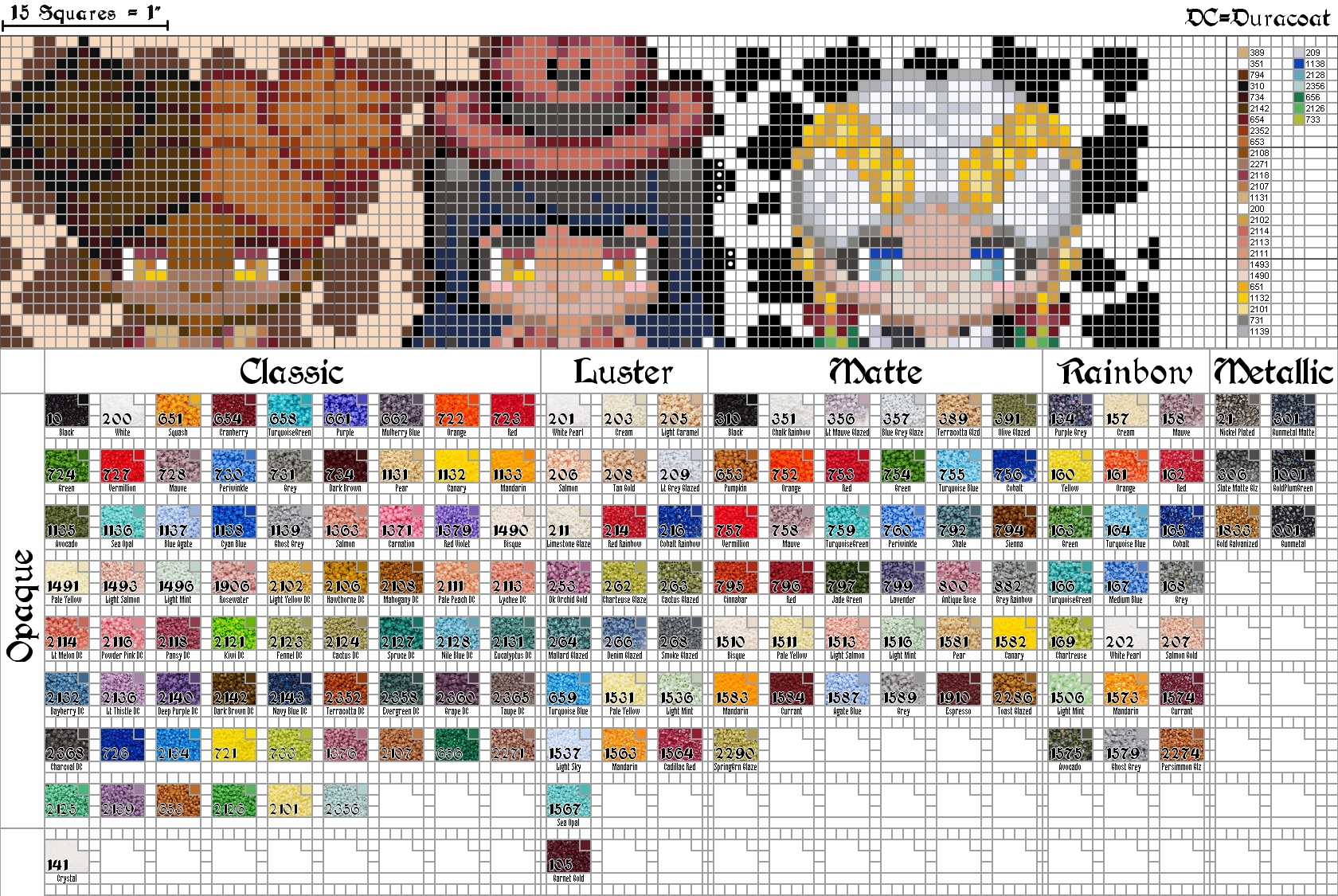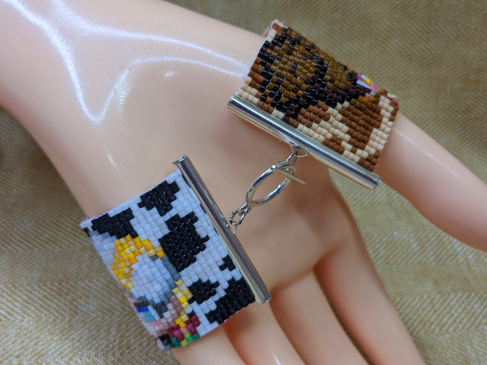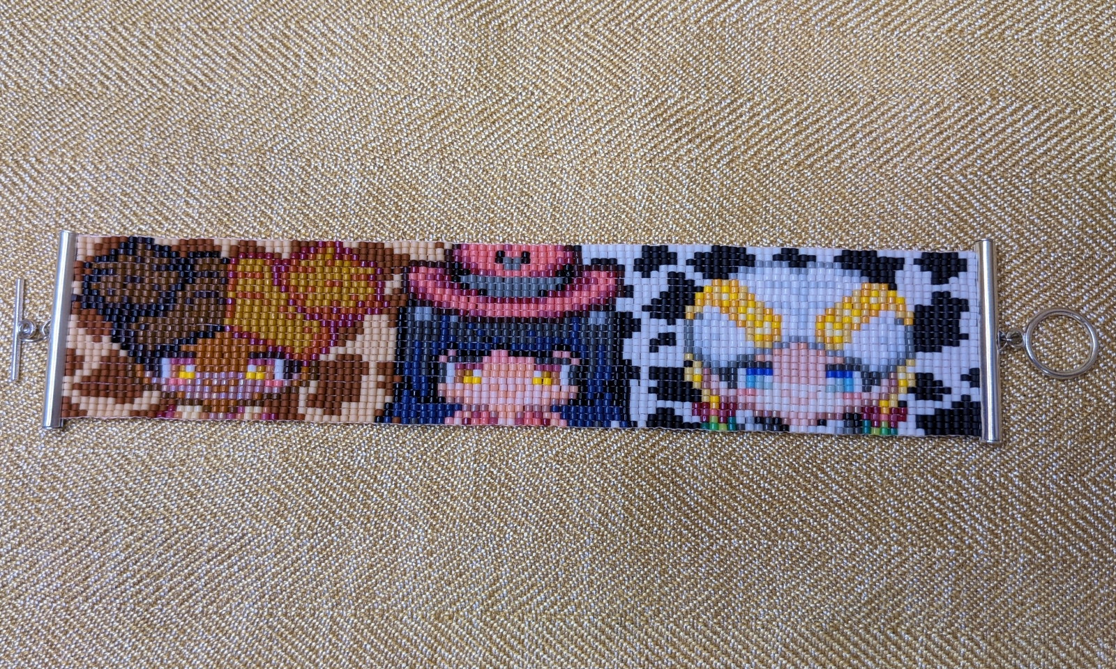 Bead loom bracelet design based on The Bofyne Unit: Omega Contract game. Features the three main characters: Carmella, Mizuki, and Vanille on a cow print themed background. Left side behind Carmella is tan with brown spots, right side behind Vanille is white with black spots, matching the character's color schemes in-game.