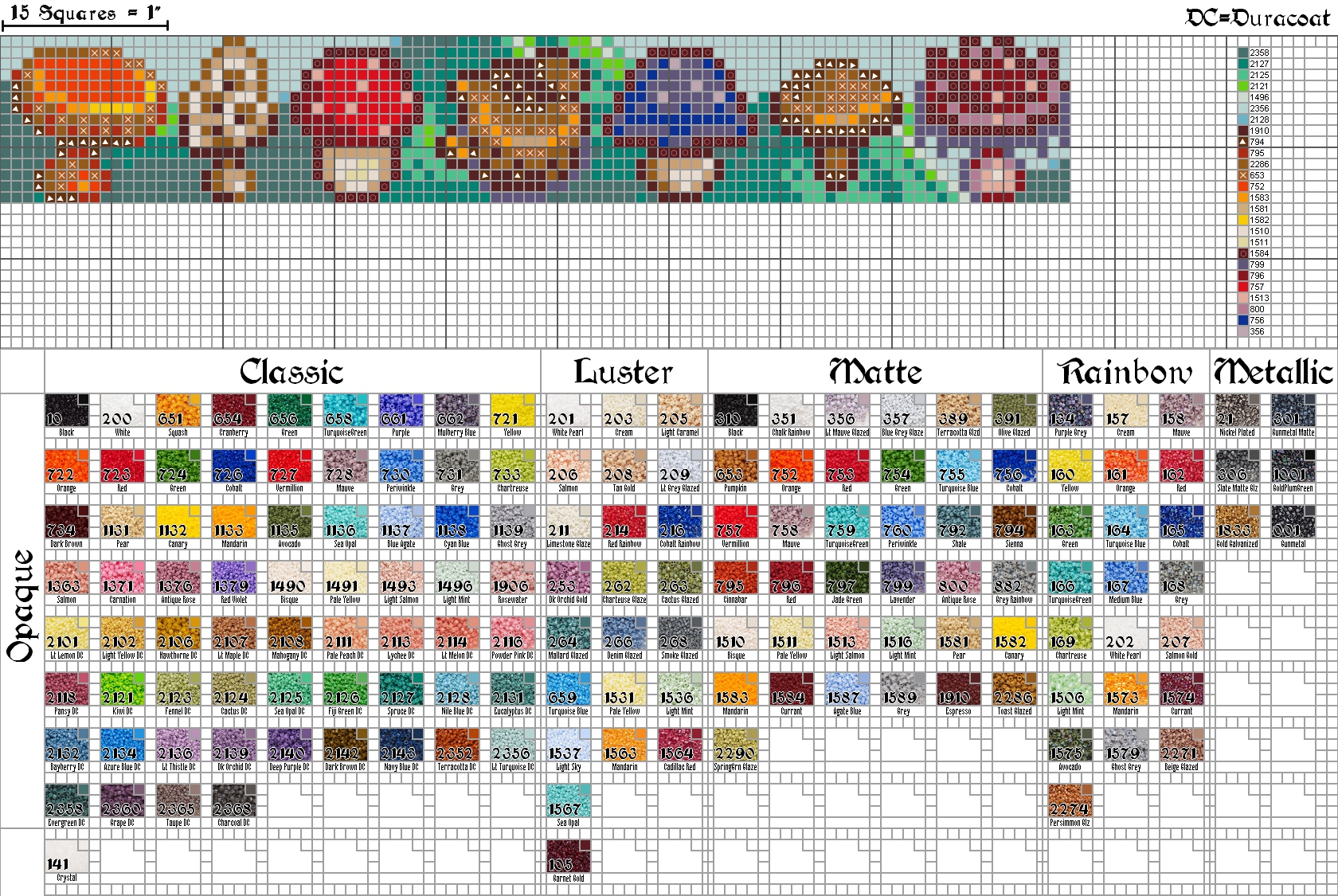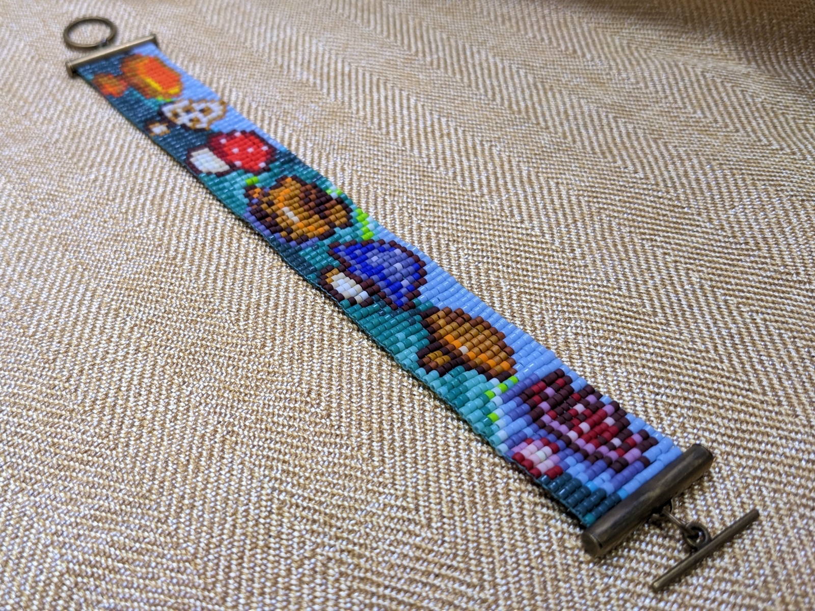 Bead loom bracelet design based on the mushrooms from Popular Farming Simulator. Background is a green/teal mountain range with a grey-blue sky, based on the game's menu screen.