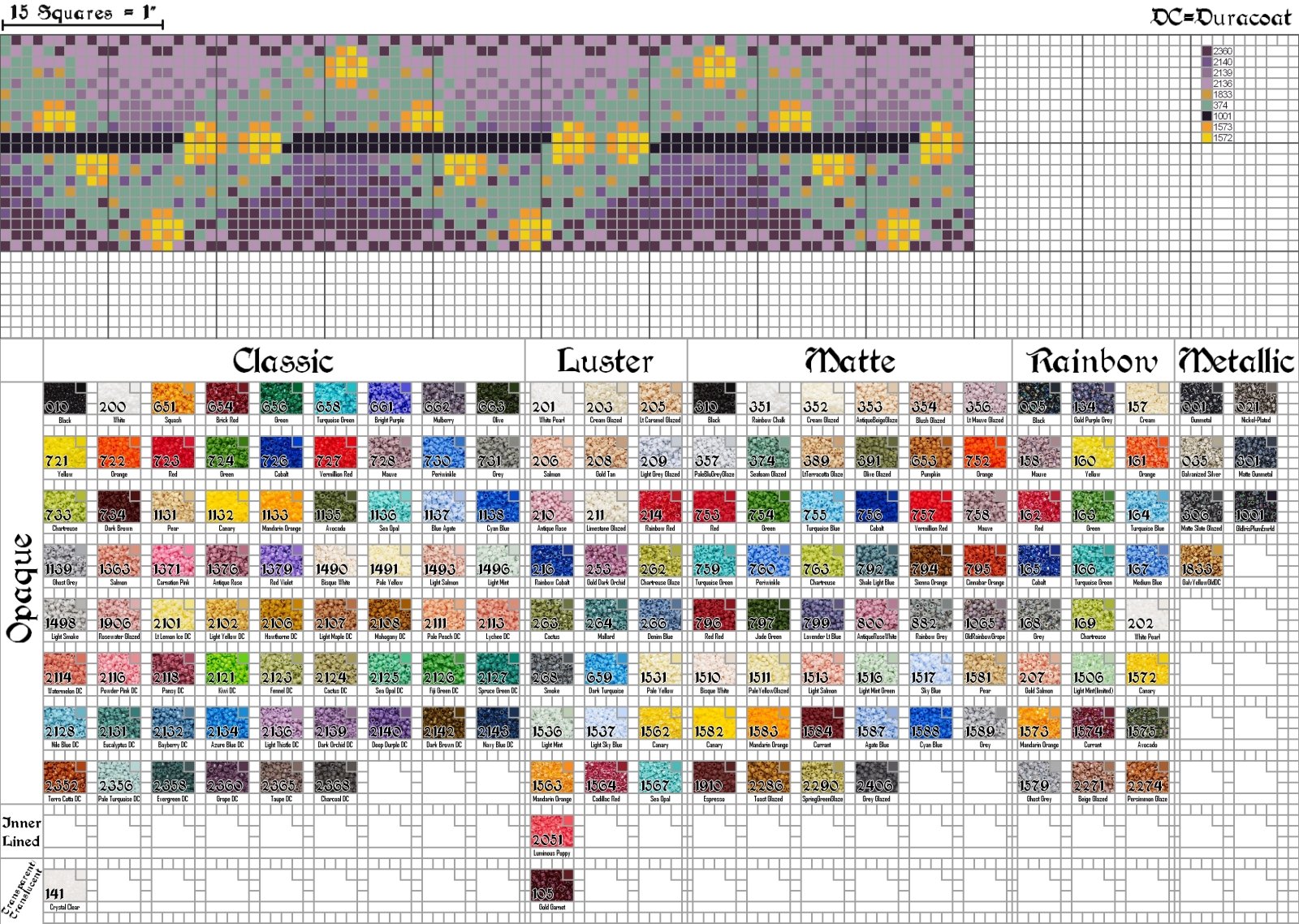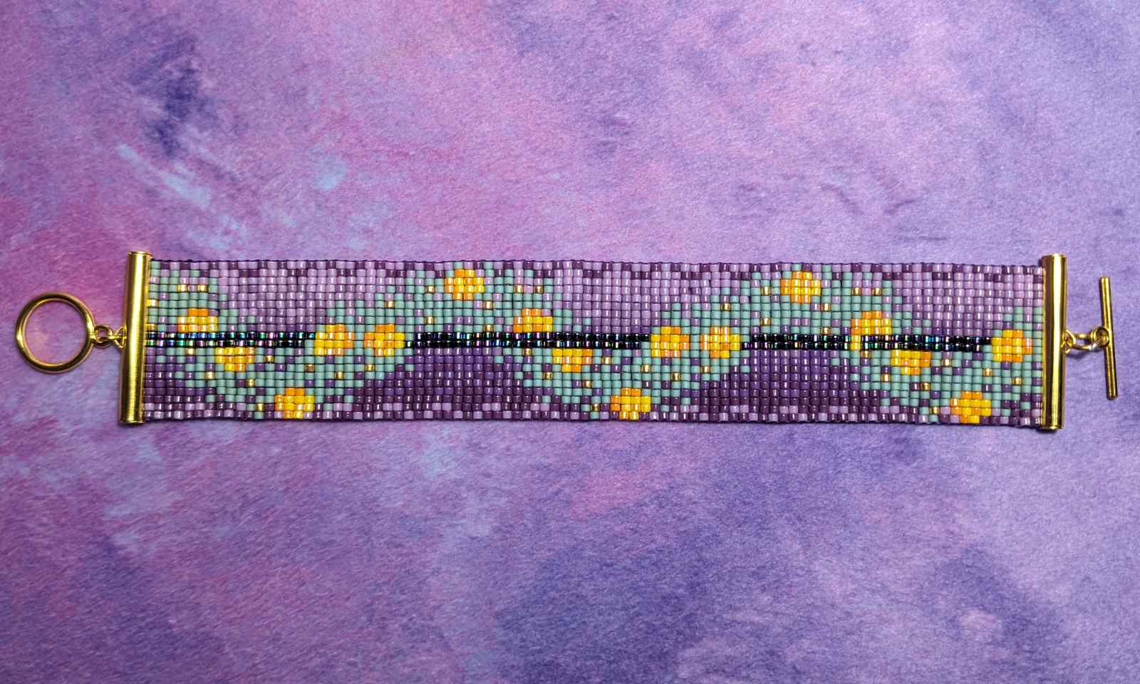 Bead loom bracelet design featuring a matte green garland with iridescent yellow roses wrapping horizontally around an iridescent black pole. Background is four shades of purple with overlapping designs to create an ombre effect.
