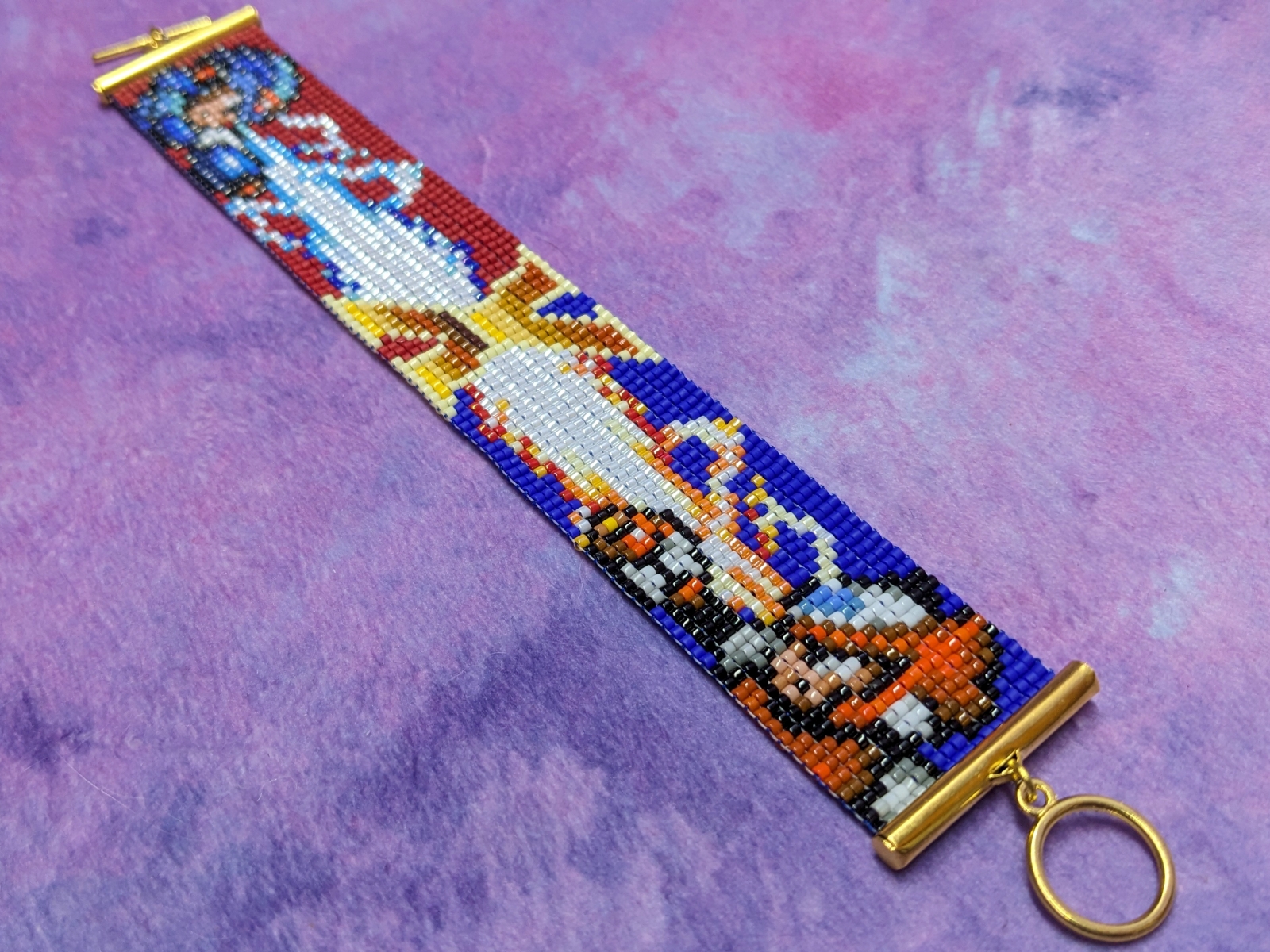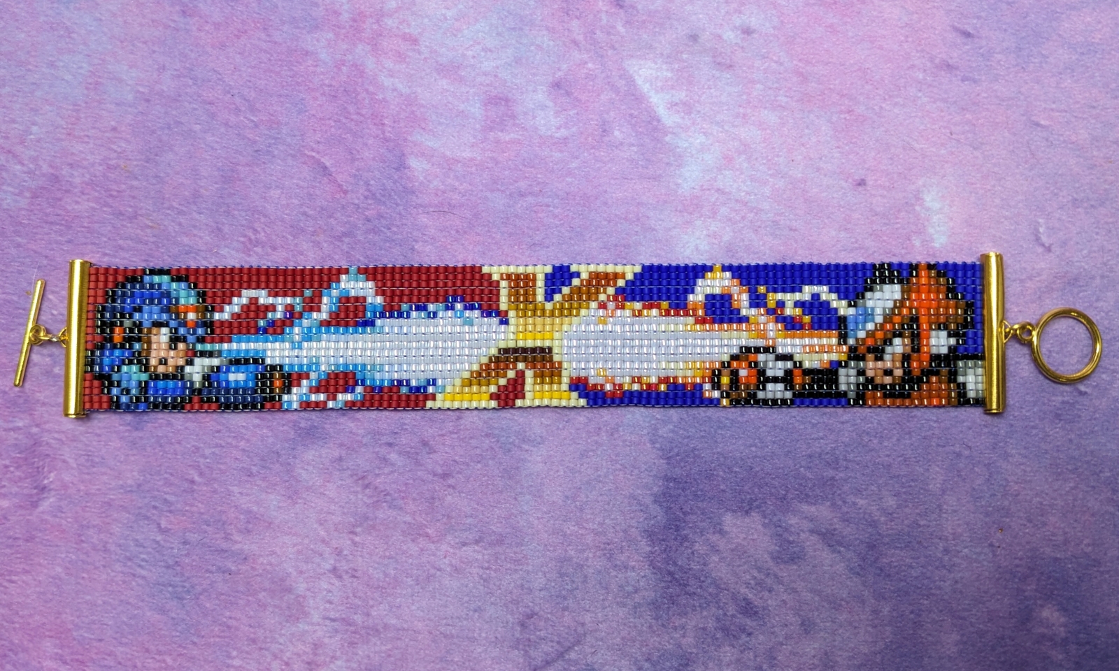 Bead loom bracelet design inspired by a game with a man with mega powers. Featuring the main characters "X" and Zero blasting color-coordinated energy beams towards each other, with a simplified "X" from the title screen in the center. X's side has a solid matte red background, and Zero's has a solid matte blue background.